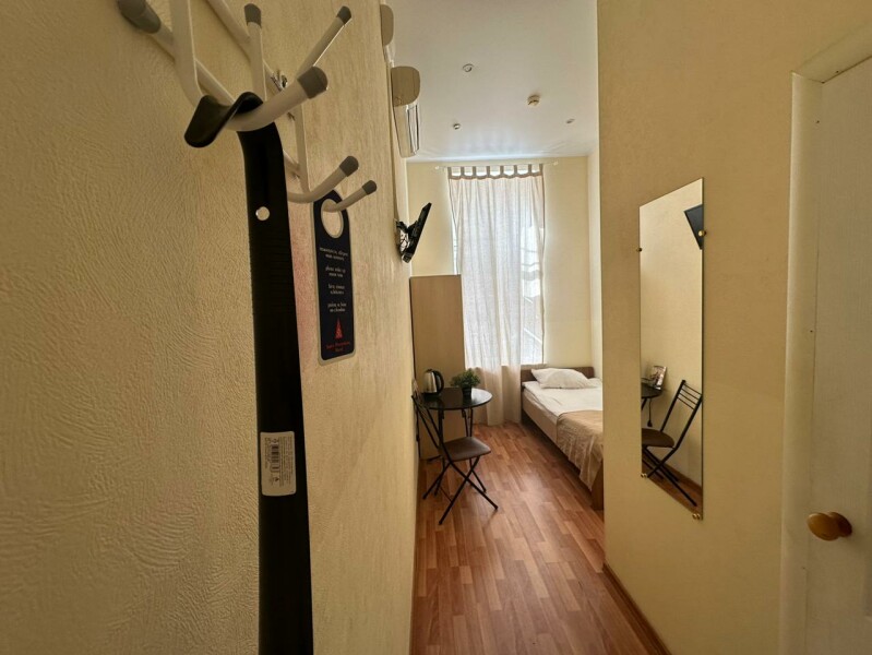 - Мебель: вешалка, зеркало, кровать односпальная, прикроватная тумбочка, стол, стулья, шкаф
